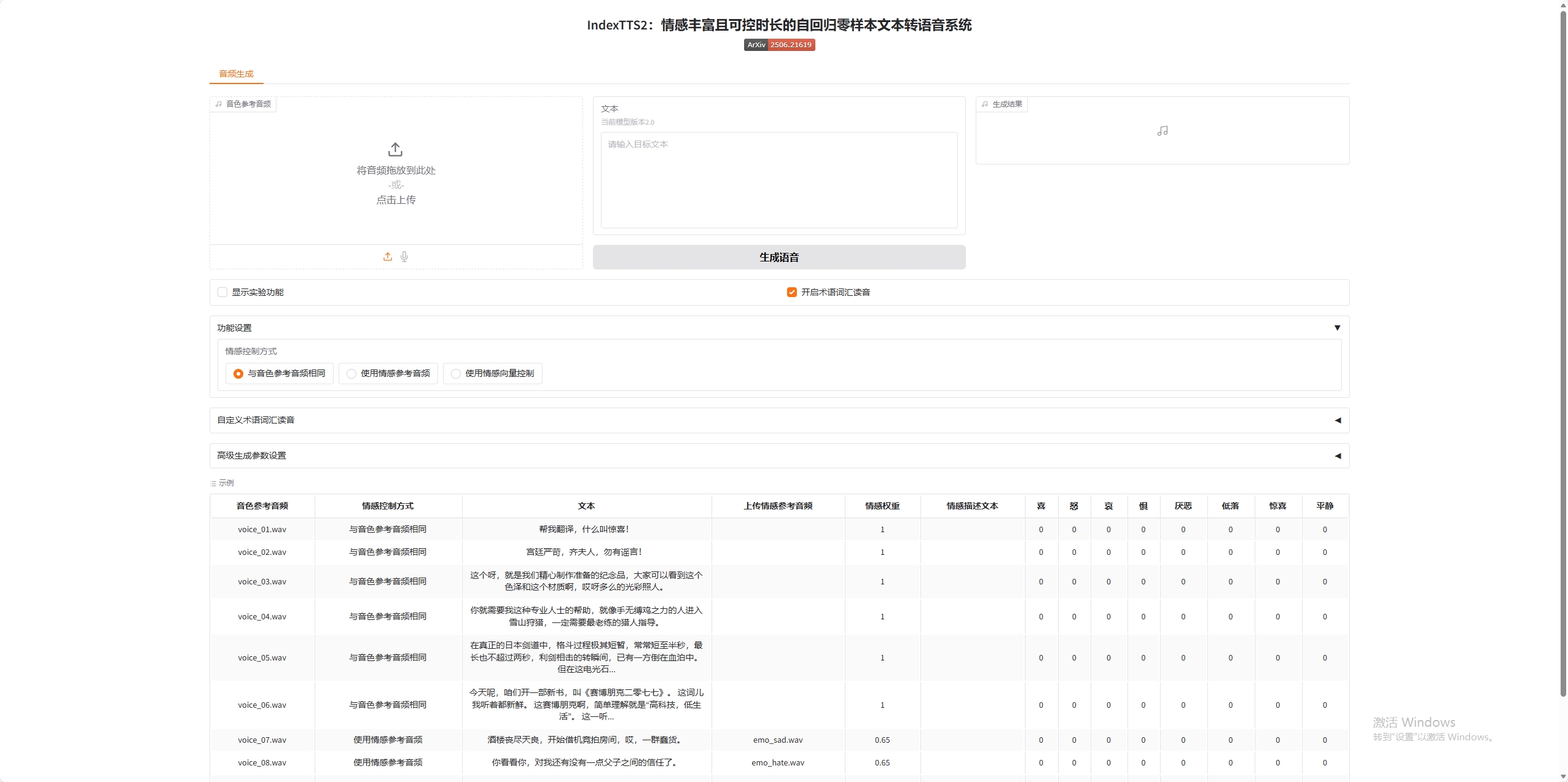 上传参考音频和文本后,在功能设置中对情感进行调节,点击生成语音即可在右侧查看生成结果